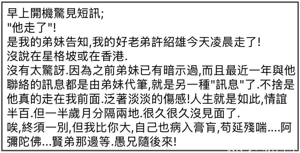 关于身体状况,冯淬帆一直心里有数,在许绍雄去世后,他在社媒发文悼念,称对许绍雄的离开没有太多惊讶,因为弟妹之前有暗示过,且这一年两人联络都是通过弟妹,本身就是一种信号。对于许绍雄的离开,他表示伤感,毕竟自己年纪更大,但人生总有一别,透露自己病入膏肓,苟延残喘,嘱托贤弟在那边等等,愚兄随后来。没想到一语成谶,5天后冯淬帆离世了。